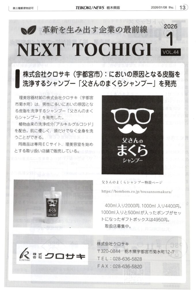 この度、帝国データバンク発行の「帝国ニュース 栃木県版(2026年1月8日号)」にて、弊社の「父さんのまくらシャンプー」が大きく取り上げられました。
